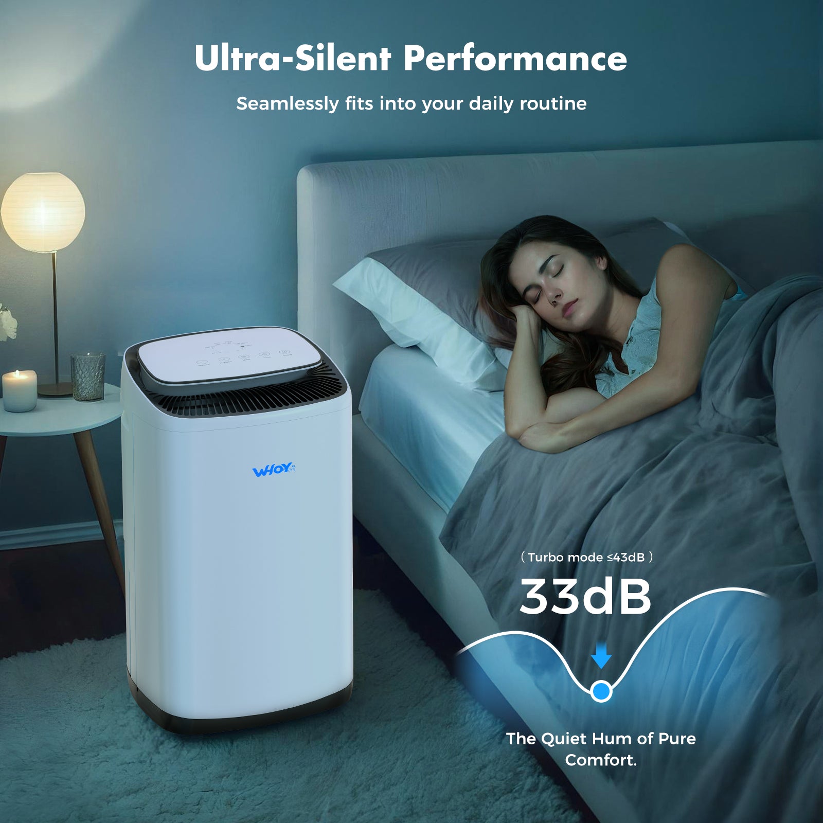- Quiet Operation: With a noise level below 45 dB, the WHOY dehumidifier runs quietly in the background, ensuring a peaceful environment whether you’re working, relaxing, or sleeping.