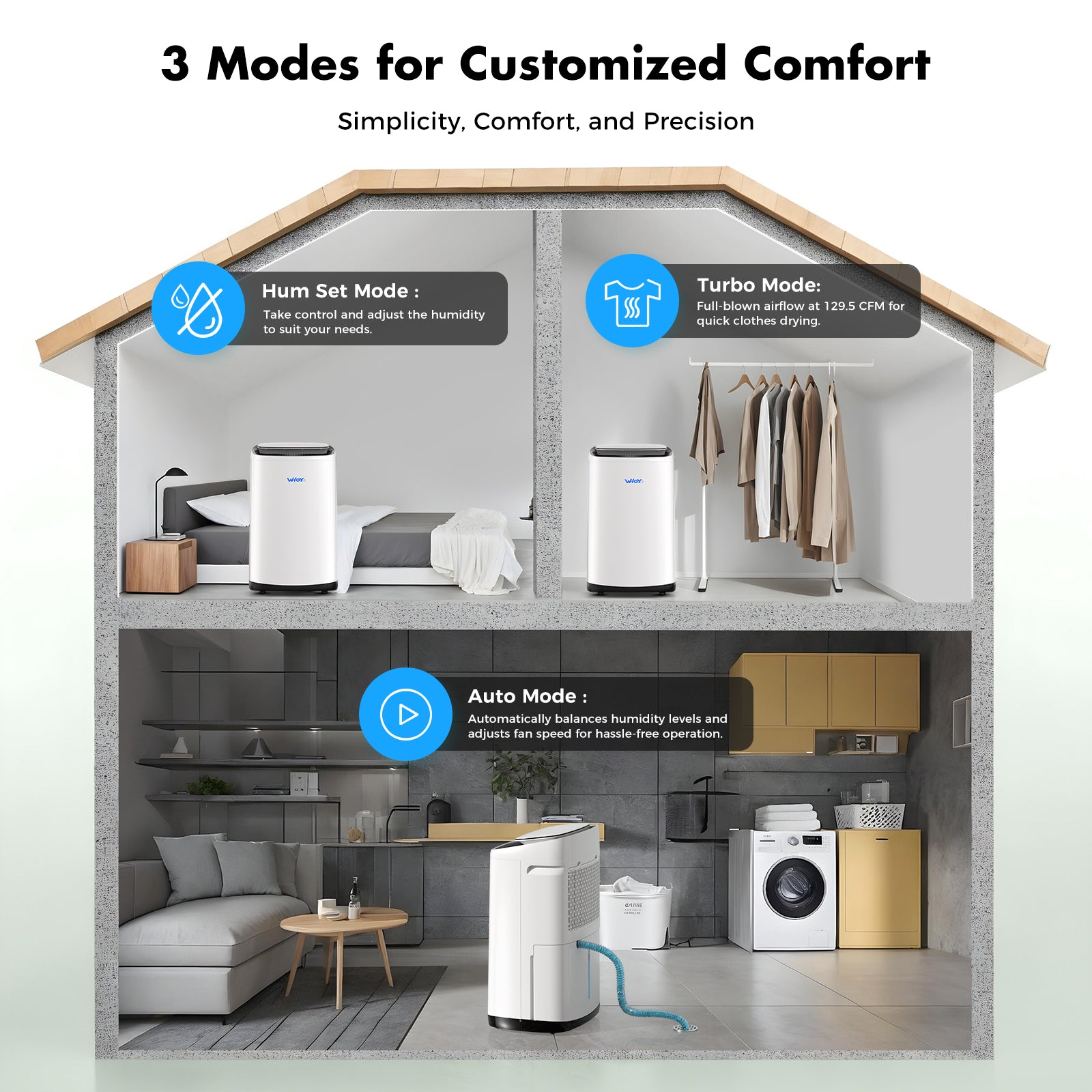 - High-Efficiency Dehumidification: Capable of removing up to 50 pints of moisture per day, the WHOY dehumidifier is perfect for spaces as large as 4500 sq. ft. Whether it’s your basement, living room, or office, enjoy improved air quality and a dry, comfortable environment.